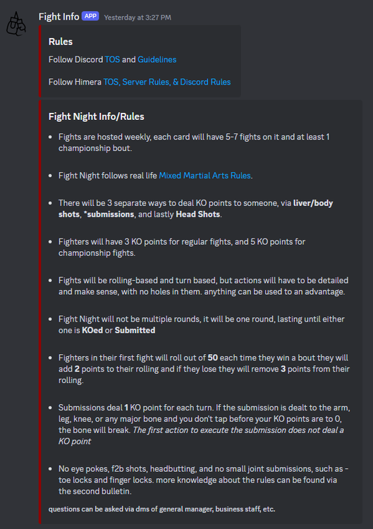 --------------------------------------------------------------------------- IGN: unhaunt Discord [ex. enderbubs]: haunteds TimeZone: EST Any Previous Bans/Warns (Minecraft Server and Discord Server): none Describe Your Current Level Of Activity In The Server. Explain Why It May Be Higher or Lower: Server isn't out yet, but I am quite active on the forums. -Times I will be active- Monday - Thursday | Active All Times. Friday | 7 Am - 5 Pm and 9 Pm to Sleep. Saturday | 7 Am - 1 Pm and 9 PM - Sleep. Sunday | 4 PM - Sleep. List All Past Faction Applications, And Mention If You Were Denied Or Accepted (Provide Links To Each Application): What Is Your Motivation Behind Applying For This Faction? My motivation is OOC-related and sorta in-game reasons, OOCLY My family is full of people who have been involved in combat sports, I enjoy watching Boxing, MMA, and Kickboxing, And I have also been involved heavily in the sport. DetailRP and CrimeRP are 2 of my favorite types of roleplay, combining them makes a perfect blend. I would love to open up this shop and let people show off their detailrp and combat skills ICLY. The shop can be used as a get-together for many people to enjoy what I enjoy. Link To Your Shop Discord Server (Permanent Link): https://discord.gg/QyATyXkXgQ Do You Have Access To A Microphone And The Ability To Join VCs? Yes, of course, and I am willing to speak. Have You Read Through The HRP Server Rules? Yes. Do You Understand The Rules Of Being A Business Owner? Yes, I do. Character Name: Kei Kato Character Age: 29 Character Gender/Pronouns: Male Describe Your Character's Personality: "My character is a very outgoing person, His personality reflects his MMA background and his love for things, I am very passionate about what I do. I am also a family man, always being surrounded by the Kato family and making sure they are well in life and sustained. I am a very resilient person, I don't give up fr, and I will always face challenges that come my way from my background. I still go to the speed back and get some punches in, and I do some light sparring with my younger brothers to teach them a few things. Who knows I might even step back in the ring myself." Do They Have Any Criminal Charges On Their Record? None What Is Your Character's Motivation Behind Opening A Shop? "My name is Kei Kato, I come from a long line of MMA fighters in my family, such as my father, and my siblings, I'm also a former MMA fighter myself. I have always been passionate about the sport. Throughout my career, I have witnessed the profound impact that MMA had on people's lives, not just as a sport but as a community, and the amount of enjoyment it brought to people. After retiring from professional fighting due to injury, I then found myself yearning to stay connected to my passion. My Motivation led me wanting to open up Fight Night, along with my younger brothers Ashura and Indra. I hope to fill Himera with a new sense of enjoyment and fun, betting on fights, drinking with the pals, and getting a quick bite to eat while also enjoying some brutal Mixed Martial Arts. " What Is The Name Of Your Shop? Fight Night What Exactly Is Your Shop (Restaurant, Convenience, Accessory, etc.) Combat Sports Association/Bar & Grill which has a Bar, Snack Shop, and Gift Shop inside of it. Provide a unique description Of Your Shop, And Why Is Different Compared To Other Shops: -Fight Night- (ticket prices are not yet thought out due to us not knowing the economy yet) "Fight Night is an MMA club with Drinks, Food, and Professional Fighters slugging it out til Knockout!" "Lemme say this have you ever seen a Business like ours that would be in Himera? Nah, Because there is nothing like it!" "Fight Night is majorly different than the rest, it offers Top-tier entertainment and customer service, We expect our business to boom throughout Himera, getting the attention of the reporters and making headlines with our highly skilled fighters and the amazing class in our establishment." "We offer many kinds of events and attractions in our establishment that will gather eyes to it. We have the best of the best bartenders and chefs, cooking up a mean meal or making a delicious cocktail! Our gift shop workers are top-tier customer service always being nice and friendly, offering deals to first-comers and deals that will make you want to buy more. Overall it is a great place to gather around and have a good time with friends, no place is like it, and no place will ever be like it." "To be a Fighter at FNC you have to be highly skilled and trained, We got the next coming of Jon Jones here, lemme tell those dudes Seno and Rio ain't no joke when it comes to controlling the ring and making an impact, Expect to jump out of your seats and come back the next week after getting a show from our fighters" Provide An Example Of Your Employee Roster, And What Each Employee Role Does In The Shop: --------------------------------------------------------------------------- -General Manager- 1/1 (shopkeeper) "I am the General Manager, or well the ShopKeeper. I make sure everyone is in check, and I will be going to suppliers to gather stuff for when we open. I make sure to train the newer people, teaching them the ropes, and when the Business is closed I go in the ring and often train a few of the newer Fighters making sure they are in top shape for their upcoming fight" --------------------------------------------------------------------------- -Co-Manager- 1/1 "The Co-Manager is in charge of the bets, and is also making sure we have the right inventory before we open up, I'm sure my little brother Ashura will do well in this spot... He's always been at the top of his class, and I expect to see great things from him. Most importantly he is my right-hand man, if I need to get more supplies he is the one in charge of the Area, He will call the shots." --------------------------------------------------------------------------- -Event Organizer- 1/1 "The Event Org