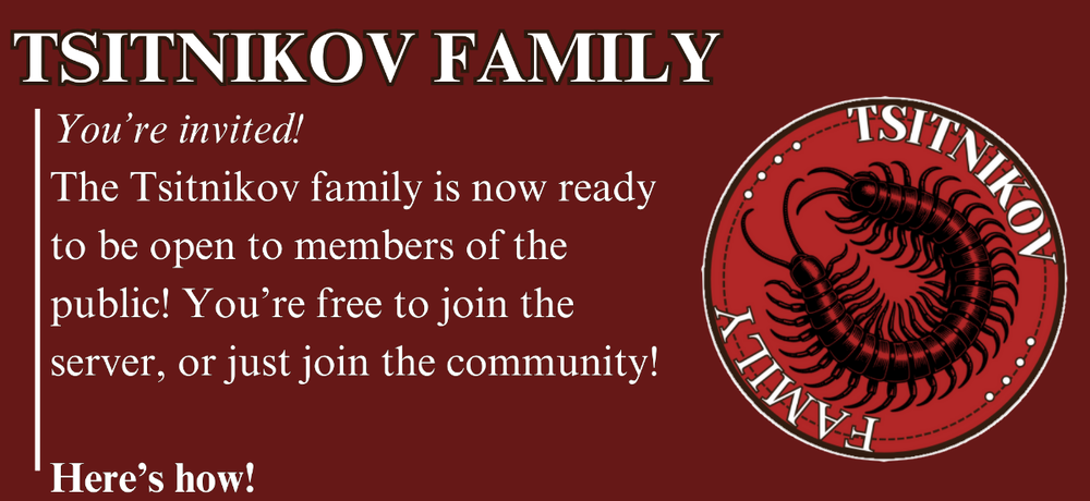 Hi guys! I just got done doing the basics for a family Discord, and was ready to invite people! It's still a work-in-progress so any help would be appreciated, but if you want to join the family early just DM me with character ideas! The invite link is https://discord.gg/2CsbvnVgSP !