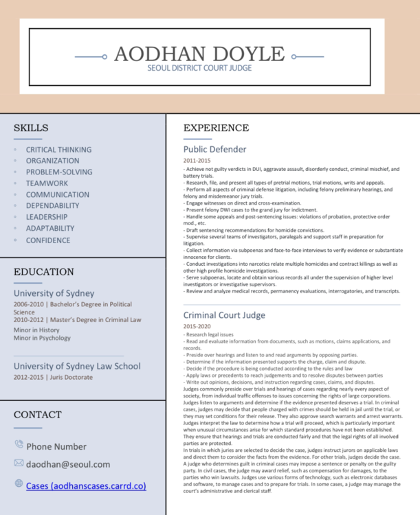 IGN: FlowerRp Discord (ex. Taco#0503) ❀ Lotus ❀#5332 Do you have a working microphone? Yes, I do have a microphone and I am comfortable in voice chats. Time zone: Eastern Standard Time Zone (EST) Previous ban/warns: None. Previous applications: https://lotusapplications.carrd.co Which position are you applying for? Judge! Describe your activity level: I would describe my activity level as an 9/10. I am extremely active within the server everyday besides the handful of hours per week I need to complete college modules for homework. Though, this college is online, and I can complete it whenever I please. I am generally available during the day. I also take one week breaks every month from online for a detox, though if any emergency icly/oocly arose, I always have my phone on me. What is your motivation for applying? I have been a part of the roleplay community for over a year now, mostly being a part of gangrp and the school faculty. Over the last 6 months, it has become repetitive, and I’ve grown to want a different form of roleplay. I started SPD on Seoul which has only grown my love for the government factions, and I am looking to join the District Court faction for three main reasons. The first reason is my experience within the faction itself. Though, it is only one case, I grew excited for it. I wanted to be a part of this experience in more ways than one, for ooc and ic reasons. The people and characters that carry these roles hold a responsibility for the city of Seoul. The decisions they make need to remain unbiased, they need to keep an open mind for each case they are given. I believe my character can provide these characteristics. The other reason for wishing to be a part of the District Court Faction is due to the friendships I’ve made with individuals who have this role and being able to interact with them both oocly and icly. These people have shown me the different scenarios that each role participates in and how each character can handle them to influence Seoul. All of these are unique experiences I have grown to love being a part of. The last reason is simple. Both my grandfather and my brother are police officers in real life. I have experienced many legal situations and have grown an oocly love for criminal justice. I have watched several criminal and law documentaries within my life, even seeing some in real life. I was very interested in the case of Johnny Depp and Amber Heard, researching it further than just watching the trial itself. If I didn’t have a deep love for animals and wished to work with them in Conservation, I would be studying criminal justice alongside my family who are current members of the force. Have you thoroughly gone through the Court Trial guide and the Justice & Legal Information? Yes, I have diligently read though the information provided to me and will continue to refresh my knowledge throughout my possession of this role. Character name: "My full name is Aodhan Doyle." Character age: "I am 42 years old." Preferred Position [Judge, Prosecutor or Public Defender]: "The position desired is that of a Judge." Nationality: "I am Australian." Preferred Pronouns: "I go by He/Him pronouns. I am a cisgender male." What motivates your character to join the faction? "The answer is quite simple. My mother was a lawyer, my eldest brother a judge. I have a clear understanding of the harmonies of court and justice. I've spent a majority of my life devoted to this role I wish to take on and I look forward to the chance to be given this position. As you can see from my resume below, I have a plethora of experience working in this field, among them including my remarkable achievements working both a public defender and a judge. I look forward to the opportunity to bring a dedicated and unbiased sense of justice to Seoul just as I did my previous projects. I have confidence in myself to be an incredible candidate for the job as Seoul District Court Judge. I have extensive levels of education and experience in law and criminal justice, being one of the most knowledgeable in my class. I have both personal, educative, and real-life experience on top of my intelligence. I believe I could not only be an intellectual candidate but also a sociable and kind-hearted one. I have confidence in myself, and love for my family and town. I wish for growth, rehabilitation, and justice. I promise to bring nothing but time and dedication towards this role. I will be hardworking, self-motivated, communicative, unbiased, and moral with my all the decisions I may bring.” List your characters set of soft skills: "I have an abundance of soft skills developed throughout my years of study to the law along with my projects done with the legal teams. I will list my most capable ones below, but some others I have obtained are listed in my resume below." 1. Critical Thinking - "I am able to perform the act of analyzing facts to understand a problem or topic thoroughly. This skill gives me the ability to collect information and data, asking thoughtful questions and analyzing possible solutions." 2. Organization - "This skill allows me to use my resources efficiently and effectively. Being organized means I am able to manage my time, energy and workspace well and can accomplish all the assigned tasks successfully." 3. Problem-Solving - "My problem-solving skill helps me solve issues quickly and effectively. It's one of my key skills to show that I am self-reliant. Problem-solving skills able me to quickly identifying the underlying issue and implement a solution." Explain any weaknesses your character might have: "Weaknesses come and go naturally for me due to my ability to adapt well in the unknown. Though, one weakness I have always struggled to overcome is my ability to be creative. I tend to perceive myself as a left-brained individual, mostly analytical and methodical in my thinking. I have the ability to be creative, just not as expressive as most." Level of education? [Ba