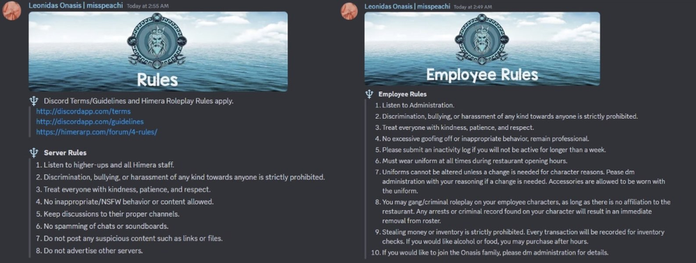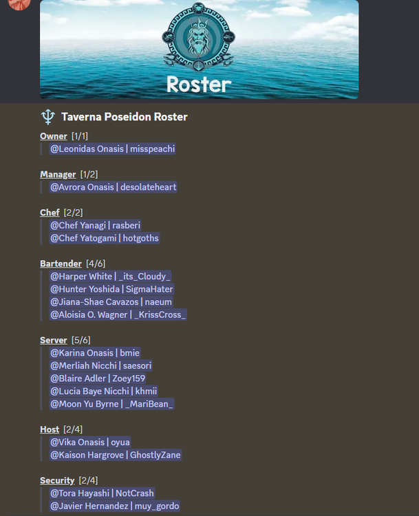 ♆ IGN misspeachi ♆ Discord [ex. enderbubs] misspeachii ♆ TimeZone NA ♆ Any Previous Bans/Warns (Minecraft Server and Discord Server) No. ♆ Describe Your Current Level Of Activity In The Server. Explain Why It May Be Higher or Lower I was a builder on the server since mid-November, working on the totality of the current map until recently. I was active everyday as a builder and when the server releases, I plan to continue being active everyday within the community and on the server itself. ♆ List All Past Faction Applications, And Mention If You Were Denied Or Accepted (Provide Links To Each Application) N/A ♆ What Is Your Motivation Behind Applying For This Faction? I have always been interested in becoming part of this faction and the idea of owning a business of my own. In real life, I have worked a decent handful of part-time jobs, mostly within a small business created by my own family members. I would like to bring this aspect of a family owned and passed down business to Himera after seeing not only the connection to the community it could bring, but also enjoying the responsibility it holds. I am well versed in leadership, holding several positions growing up. I take great interest in guiding those around me and providing an enjoyable environment for those to experience. Not only the leadership, but also the planning that goes into owning a business on a roleplay server is something I am fond of. I plan to not only research the products I will be selling, but also how my business will appeal to the players. ♆ Link To Your Shop Discord Server (Permanent Link) https://discord.gg/ZW55a8qFEx ♆ Do You Have Access To A Microphone And The Ability To Join VCs? Yes. ♆ Have You Read Through The HRP Server Rules? Yes, I have read through and agree to all Himera Roleplay server rules. ♆ Do You Understand The Rules Of Being A Business Owner? Yes, I have read through and understand all the rules to being a business owner on Himera Roleplay. ♆ Character Name Leonidas Onasis ♆ Character Age 42 ♆ Character Gender/Pronouns Male, he/him ♆ Describe Your Character's Personality On the outside to anyone who may flash a glance at Leonidas would see a clean-cut businessman with a friendly, yet a little cocky, demeanor. He is confident of his family business, his eyes beaming as he talks of his family’s hand-crafted recipes. You will often find Leonidas working at his restaurant and bar, only taking breaks for a quick smoke by the beach or well after close when he finally goes home. Though, his workaholic nature is what keeps his family’s business alive and thriving. ♆ Do They Have Any Criminal Charges On Their Record? No, Leonidas has a clean record, he has never been caught up in any illegal business or behavior. He grew up in a traditionally moral family. ♆ What Is Your Character's Motivation Behind Opening A Shop? Leonidas’ ancestors have owned and ran Taverna Poseidon for generations, sharing fresh alcohol from their very own vineyard and traditional Greek cuisine from hand-crafted family recipes. Leonidas as a young boy grew up in Himera, learning all of their family recipes from his mother, spending his mornings tending to their vineyard and the evenings cooking traditional Greek meals for the family. He heard stories of the restaurant, how their family living in Greece celebrated their culture through food, and how his mother still used the original recipes. Though, when his ancestors had picked up and moved to Himera long ago to start a new life, the restaurant stayed behind. His family had moved on to other lines of work, though Leonidas wanted to keep his family’s recipes alive for everyone to enjoy. He worked hard as a teen and eventually went to college for business, learning the ins and outs of the responsibilities for owning a restaurant. Leonidas was finally able to purchase a beautiful building on the ocean to bring back Taverna Poseidon, finding local fresh ingredients to supply his menu of wines and cuisines. Some ingredients coming from their own family vineyard which the family worked hard creating their own traditional alcohols and brands of wine. ♆ What Is The Name Of Your Shop? Taverna Poseidon ♆ What Exactly Is Your Shop (Restaurant, Convenience, Accessory, etc.) Restaurant and Bar ♆ Provide a Unique Description Of Your Shop, And Why Is Different Compared To Other Shops Taverna Poseidon is a Greek restaurant and bar sharing traditional Greek alcohol and cuisine from hand-crafted family recipes and ingredients. Taverna Poseidon’s experience varies from the average right when you walk through the doors. You are transported into Greek life, sitting by the beach as you sip fine wine and dine on exquisite foods, or sitting at the bar socializing with traditional Greek alcohol transported fresh from the family vineyard. Right from your very own seats, customers are able to experience the chefs creating their one-of-a-kind authentic meal from an open-view kitchen, the traditional Greek cuisine smells filling your nose. Customers at Taverna Poseidon will experience a community of well-trained staff, beautiful views, comfortable high-quality seating, and the sound of Greek music. The atmosphere will be welcoming, inviting those to enjoy a carefree time of dining, wine tasting, and dancing. Those who come to Taverna Poseidon leave with new experiences to their memories, and original recipes to share with their own friends and families. ♆ Provide An Example Of Your Employee Roster, And What Each Employee Role Does In The Shop Employee Roster Role Descriptions Owner The owner is the biggest job within a business, being the sole leader to each role being played. They are in charge of the day-to-day operations from hiring employees, to supplying inventory. They keep communication with the staff to ensure smooth transactions with customers to ensure an enjoyable experience all around. The owner also is in charge of marketing initiatives, includ